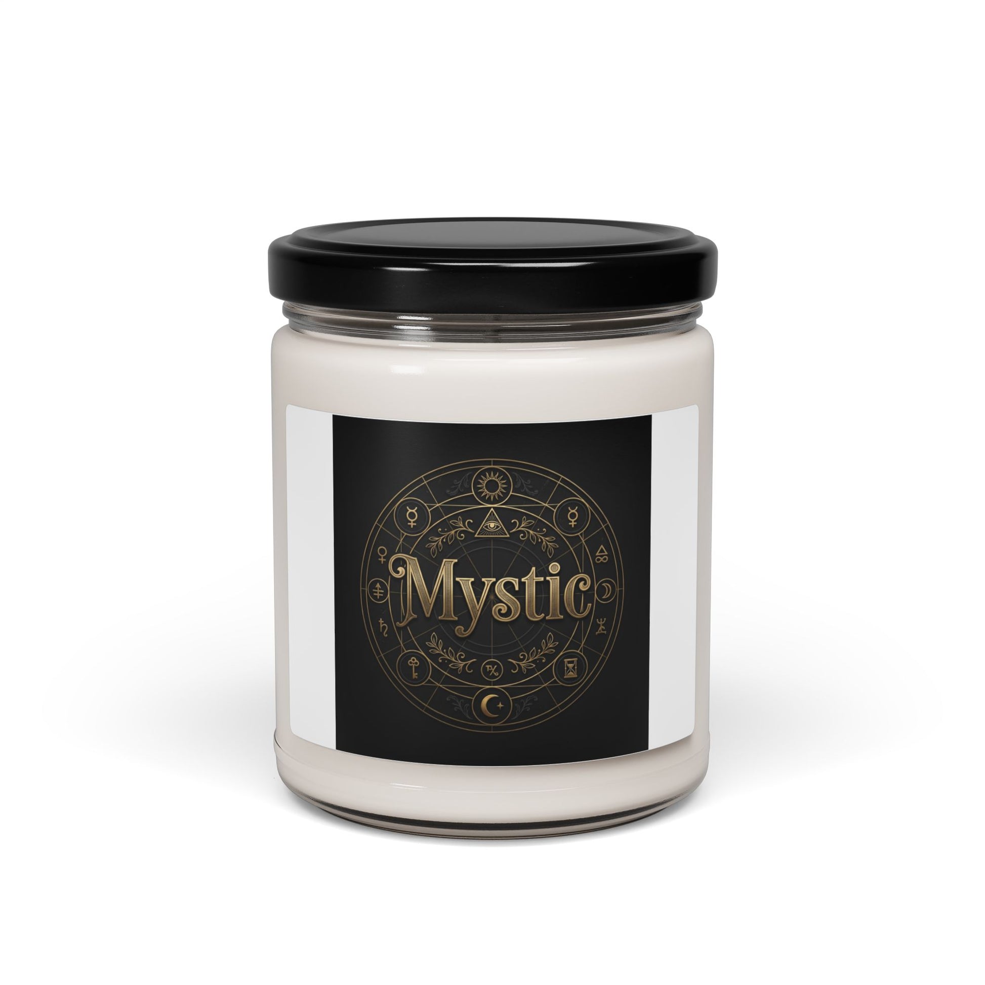 Mystic — a type-led occult soy candle that pairs gilded, alchemical typography with a velvety dark label for a quietly ritualistic mood. The design centers on ornate serif lettering reading “Mystic” set within a circular sigil motif; gold-on-black printing gives a metallic, tarot-inspired feel that complements alternative, witchy interiors. Choose from 12 scent options (including White Sage + Lavender, Cinnamon Vanilla, and Unscented) to match evening rituals, reading nooks, or meditative spaces where subtle aroma and symbolic type deepen atmosphere.