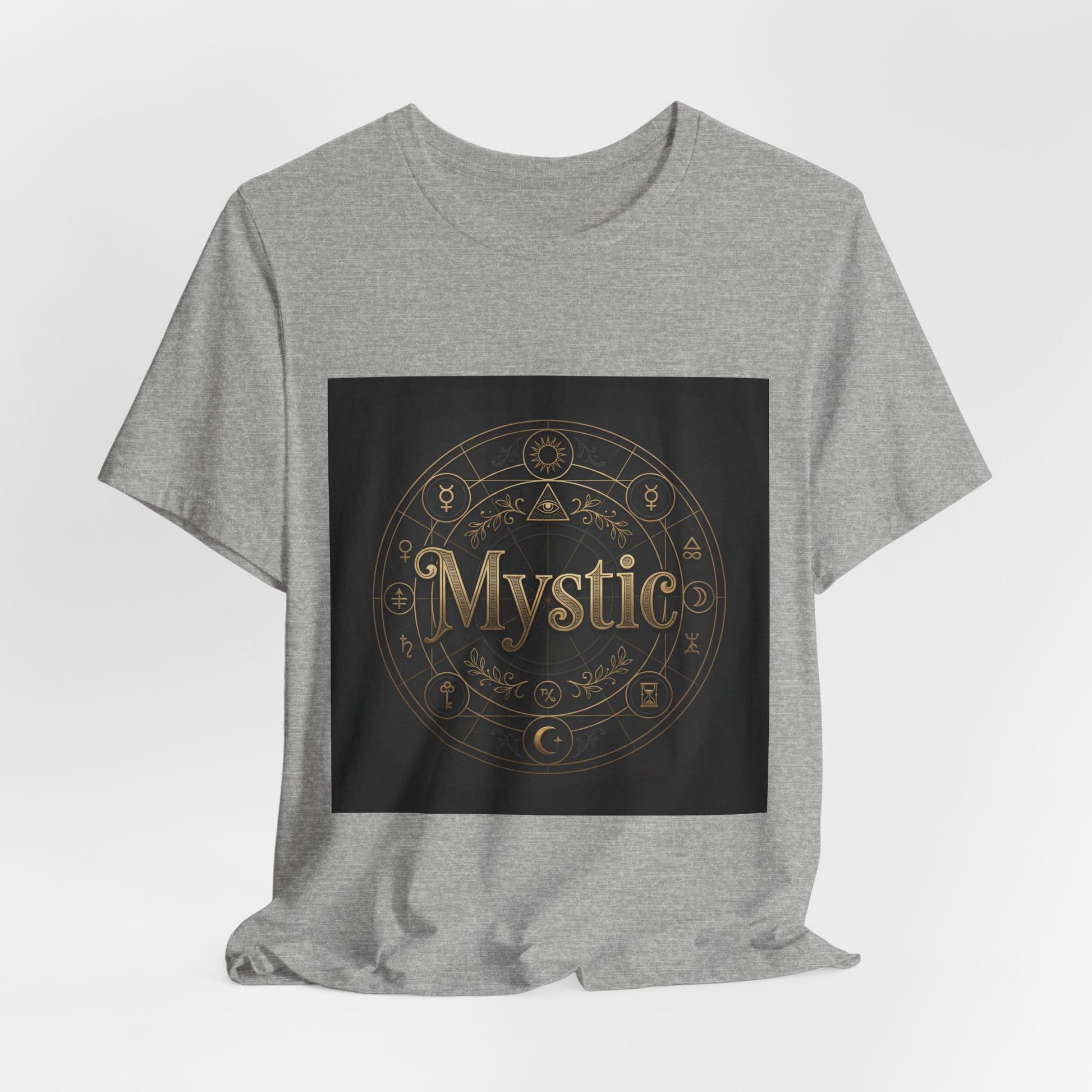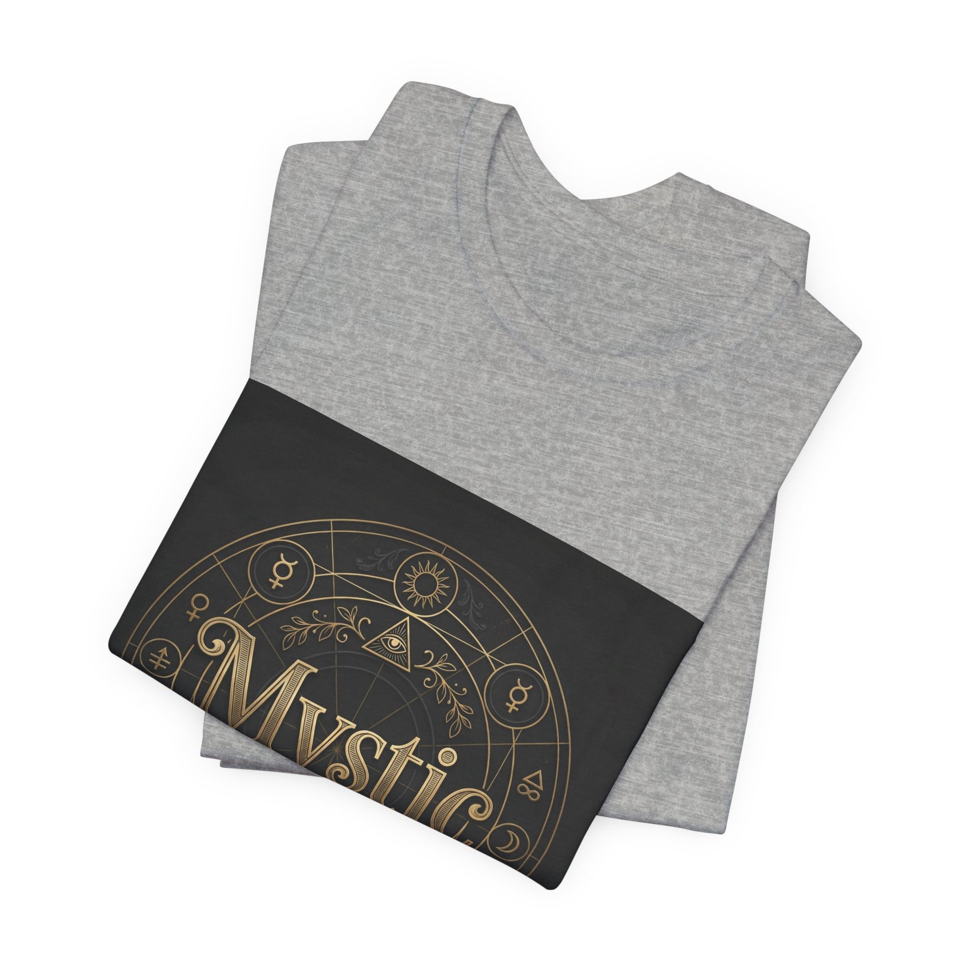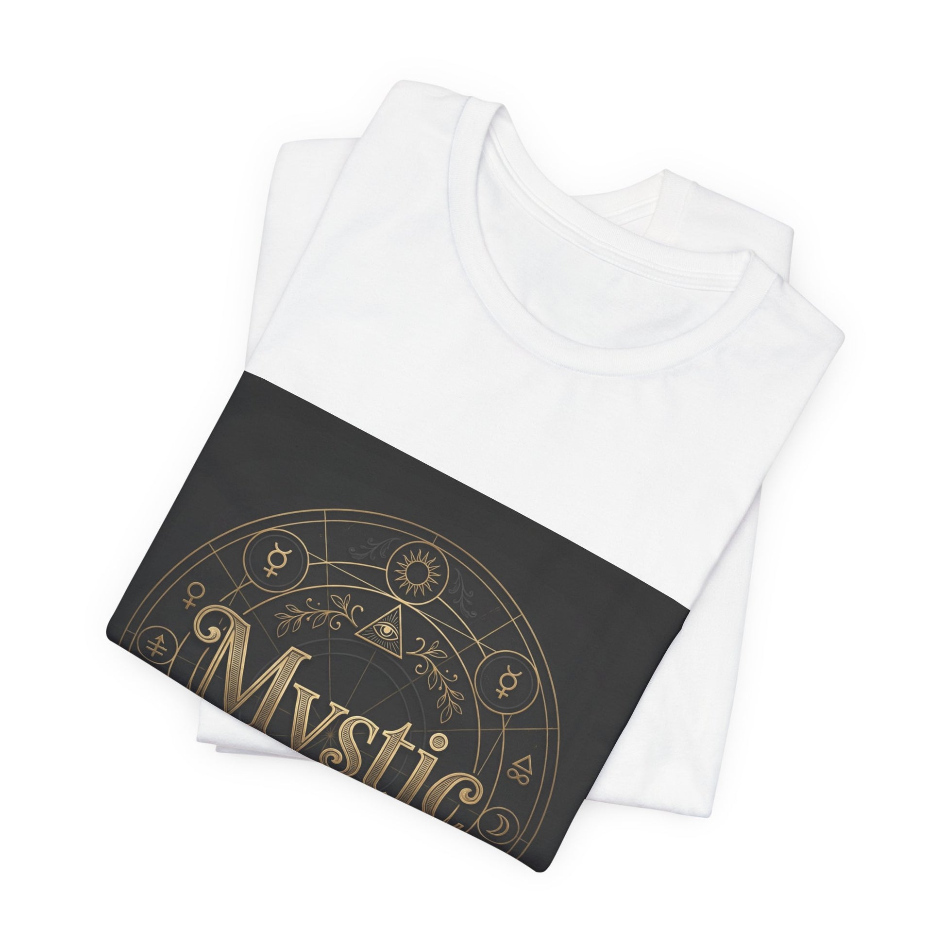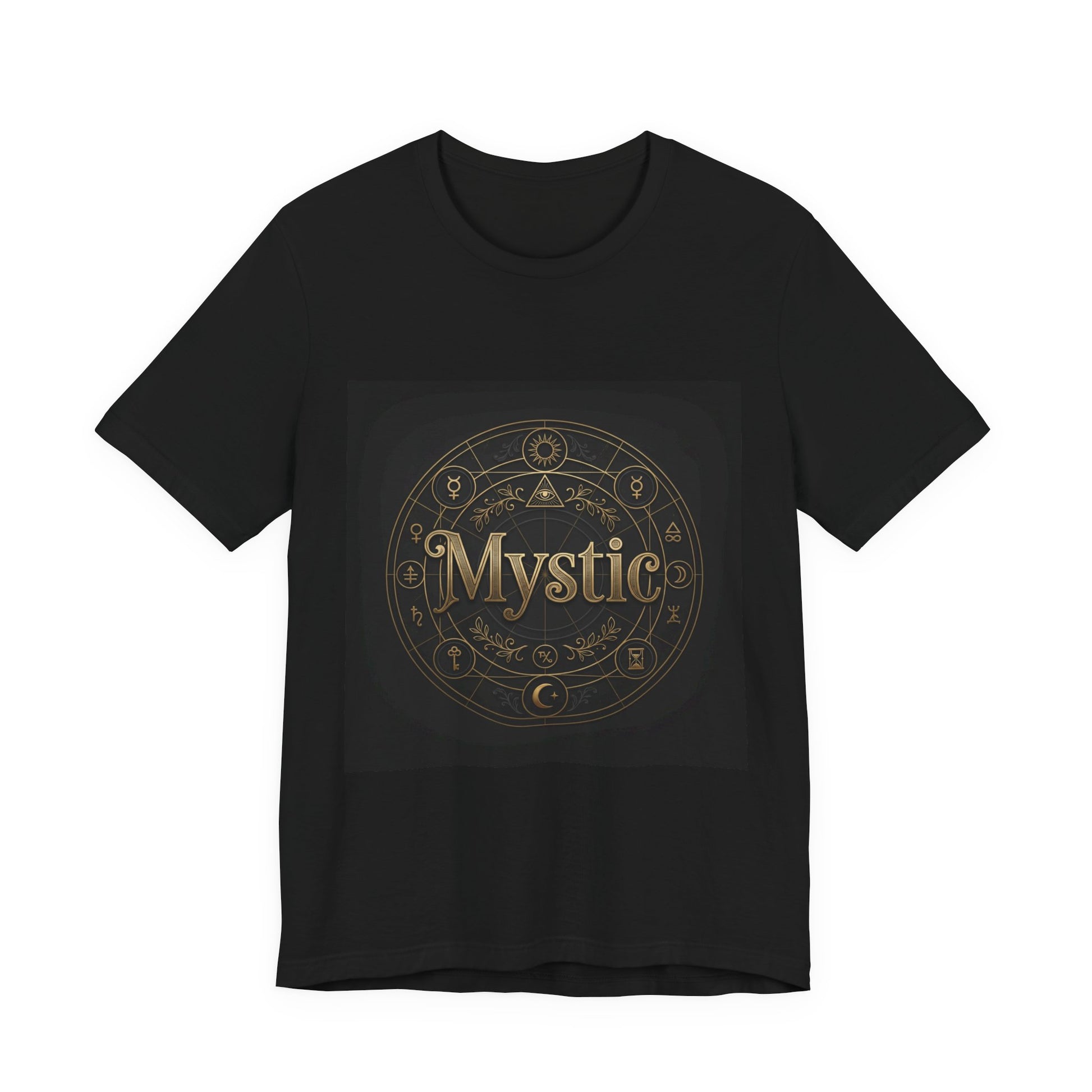 A type-led occult tee that layers gilded mysticism over a velvety dark field. Ornate serif lettering spells “Mystic” at center within a circular sigil-like frame of moons, stars, and geometric alchemical marks—rendered in metallic gold tones against a deep charcoal square. The result reads as tarot-adjacent typography for readers of esoteric aesthetics who prefer subtle, structured symbolism on everyday wear.